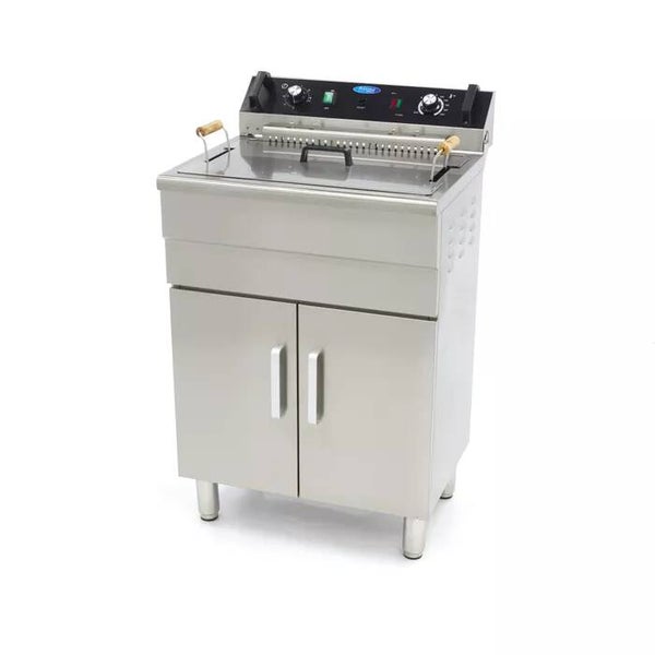 Si vous souhaitez faire frire de grandes quantités de frites, de snacks, de légumes, de poissons ou d'autres articles, cette friteuse polyvalente d'une capacité de 35 litres est parfaite. Elle s'intègre dans toutes les cuisines de restauration où l'on fait beaucoup de fritures. La friteuse est livrée avec une armoire en acier inoxydable. Grâce à celle-ci, vous pouvez facilement créer une capacité supplémentaire dans votre cuisine sans prendre de place sur un comptoir ou une table. L'armoire de base est équipée de deux portes en acier inoxydable avec poignées. Un robinet de vidange est fixé à la base afin que vous puissiez rapidement changer l'huile. Vous pouvez stocker de l'huile de friture supplémentaire à l'intérieur. La friteuse est équipée d'un couvercle amovible et toutes les poignées sont résistantes à la chaleur. Les résidus de friture sont recueillis dans la grille fournie, qui peut être facilement fixée à la friteuse.